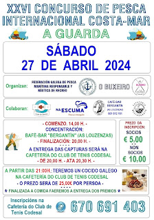 ..... XXVI CONCURSO DE PESCA INTERNACIONAL COSTA- MAR - SÁBADO 27 DE ABRIL DE 2024 - ORGANIZA A FEDERACIÓN GALEGA DE PESCA MARÍTIMA E A ASOCIACIÓN DE PESCADORES "O BUXEIRO " .
